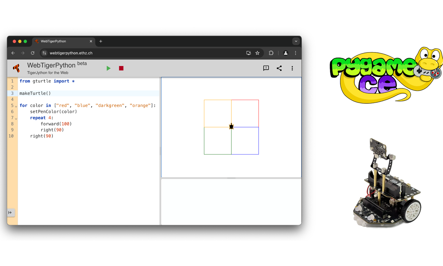 WebTigerPython ist eine browserbasierte Programmierumgebung für Python, die sich besonders für den Einsatz im Unterricht eignet. Neben bekannten Einstiegsbibliotheken wie Turtle-Grafik und gpanel bietet die Plattform zahlreiche weiterführende Funktionen, die im schulischen Kontext oft wenig genutzt werden.